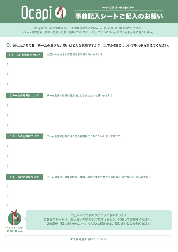 Ocapiを使った話し合いの進め方、手順、ポイントなどがまとまっています。ファシリテーションや進行の参考としてご活用ください。